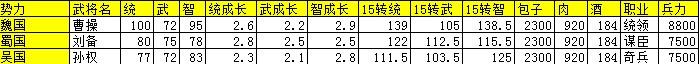 作为各国的君主,顿悟所需的材料都是一样,包子2300、肉920、酒140。但是兵力的属性和兵力的差别就大了。曹操的三围最高,兵力也最强,而孙权和刘备有些不分伯仲了。