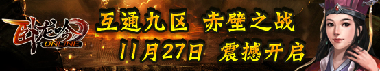 《卧龙吟》互通九区——赤壁之战将于2012年11月27日14:00震撼开启。自《卧龙吟》互通专区上线以来,在线人数节节高升,不断有玩家前来询问新区何时开启。对于玩家的热情与对《卧龙吟》的喜爱之情,《卧龙吟》运营团队决定于2012年11月27日14:00正式开启互通专区第九大服务器——[互通九区]赤壁之战。舟船相连,火烧赤壁,体验无与伦比的海战体验。