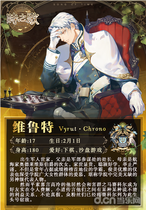 出生军人世家,父亲是军部参谋处的处长,母亲是航海家奥德莱维斯伯爵的次女。家世显贵,聪颖好学,举止严谨,不但是常年占据成绩榜榜首地位的学霸,俊美优雅的仪表也深受学院广大女性群体的爱慕,堪称学院中完美无缺的男神级代表人物。然而平素寡言高冷的他居然会和害群之马赛科尔成为好友实在令人费解,小道传言他们之间有某种某种说不清的利益关系,不论真假,众粉丝们已经将赛科尔列为此生头号宿敌。