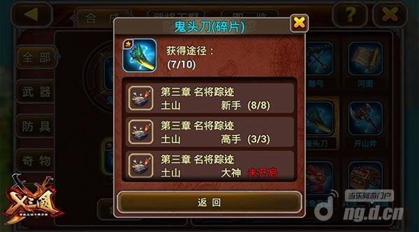 绿装是木有用的,尽快把武将的装备都升级成蓝色或者紫色才是硬道理,怎么找装备呢?了解你的武将有哪些缘分装备,然后去扫副本收碎片就可以啦!比如张辽的缘分装备鬼头刀,找到获得的关卡,扫个痛快!军令有限,且扫且珍惜哦!收集满碎片合成,别忘了再强化一下,就战力百倍啦!