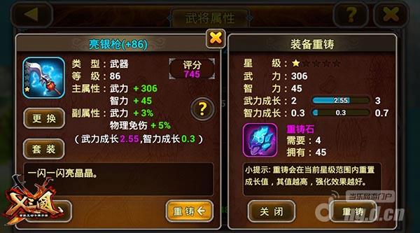 装备的成长也相当重要,收到的装备成长值不高,就要去重铸一下!重铸是有概率的,一般从绿色状态升到金色,就成极品了!有些装备是有多种属性的,根据武将的特点来重铸就好啦!比如输出型的需要武力高一点,辅助更看重智力等等!