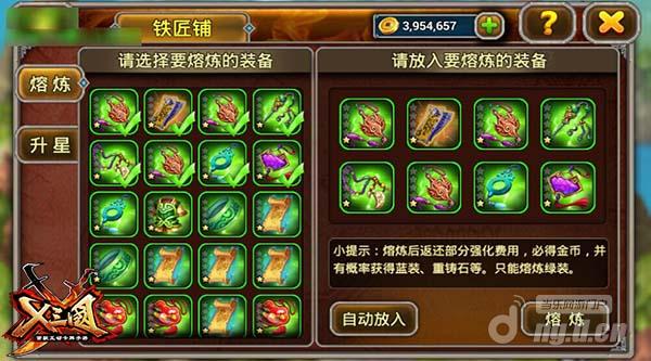 小伙伴们在《X三国》的副本战役中经常能捡到掉落的装备,随着战斗深入,等级升高,好多绿色装备就变成了鸡肋,留着占地方丢了又觉得可惜~这个时候你就可以把自己的囤货全部扔到铁匠铺里去熔炼掉了。