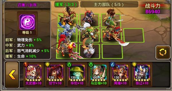 这个阵容的特点是可以触发大量的武将缘分,每个武将都有缘分被触发,主力还会触发更多缘分,而且上单挑的只有单挑最强之一的关羽,其他人都不会被选上单挑,不管是攻击还是防守,都是无懈可击的。