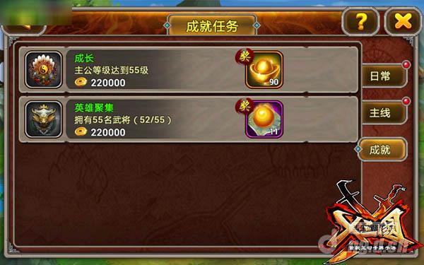 在主线任务、日常任务之外,《X三国》还为游戏中的高端玩家提供了“成就任务”。游戏中的成就任务是一个固定系统,玩家每完成一项便可以收获奖励,而该任务也将不会再被完成。相对于其他两大任务系统,成就任务的涵盖更加宽广,难度也相对较大。达到一定等级、招募一定数量的同品质卡牌、持有一定数量的卡牌、达到相应的官阶等成就任务并不是玩家可以轻松完成的,但其对实力的彰显以及元宝、经验丹等堪称奢侈的奖励也将成为玩家实力的证明。