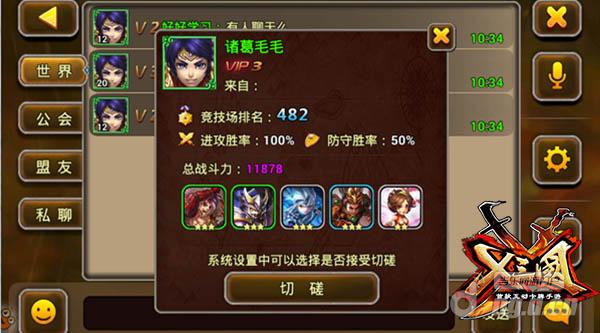 在诸多精彩的聊天系统内容中,《X三国》全新推出“好友切磋”功能,玩家可以点击在聊天系统中的好友头像,点击“切磋”进入PK。系统并不会强制要求被切磋玩家进入战斗,而是将会自动按照玩家当时的上阵阵容安排对战,被切磋玩家可以在私聊频道内看到切磋的结果。“好友切磋”功能的加入,让聊天系统更加精彩,聊天也能无限激情。