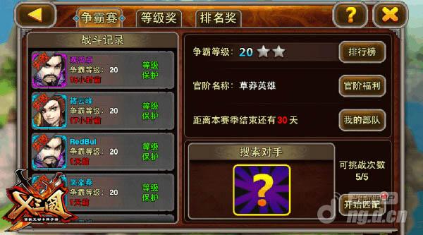 争霸赛中一共分为20个等级,每个等级都有一定的星,数等级越小,表示越高;每个争霸赛等级都有对应的星数,每次战斗胜利后奖励一颗星,连续3次胜利后属于连胜,连胜可获得二颗星,当星数满时晋升到下一等级,每次失败扣一颗星,当该等级段没有星时再次失败后降一级。要看看对手究竟功力多深?只要一看等级与星星就知道他究竟是大神还是菜鸟了!