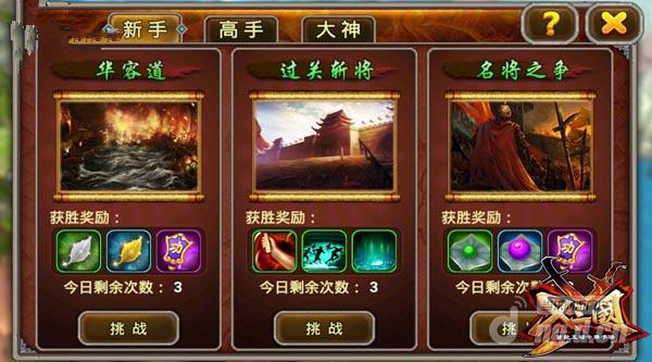 过关斩将需要小伙伴们的游戏角色等级达到15级开启,玩家需要选择一名自己的得力战将,通过单挑的模式,勇闯六关!新手难度同样每日可以桃绽3次,6关全部通关以后可以获得阵法的碎片,这一关卡完全靠武将的培养了,一夫当关万夫莫开,说的就是过关斩将以一当十的威风凛凛了!