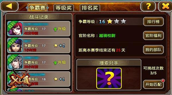 群雄争霸是《X三国》特有的PVP战场!和竞技场不同的是每天只能打5场,不能靠任何手段增加次数,不能手动操作,这就决定了群雄争霸的玩法也是别具一格的!