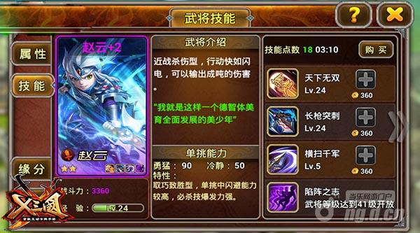 有的人问,为什么等级一样,可是战力的差距这么大?《X三国》中能强化武将的方式很多,千万不要忘记给英雄加装备和升级,加装备强化啦,用功勋进阶啦,足够的将魂还可以提升卡牌的星级品质。技能点数最多是50个点,每个点的CD是6分钟,打开游戏点一点,下线之前点一点,一般主流的技能加满就差不多了。打到经验丹就赶紧吃吃吃吧,英雄等级就上去了,英雄等级上不去,技能就上不去,推图推不动,各种战场被各种虐,还能愉快地玩耍吗?