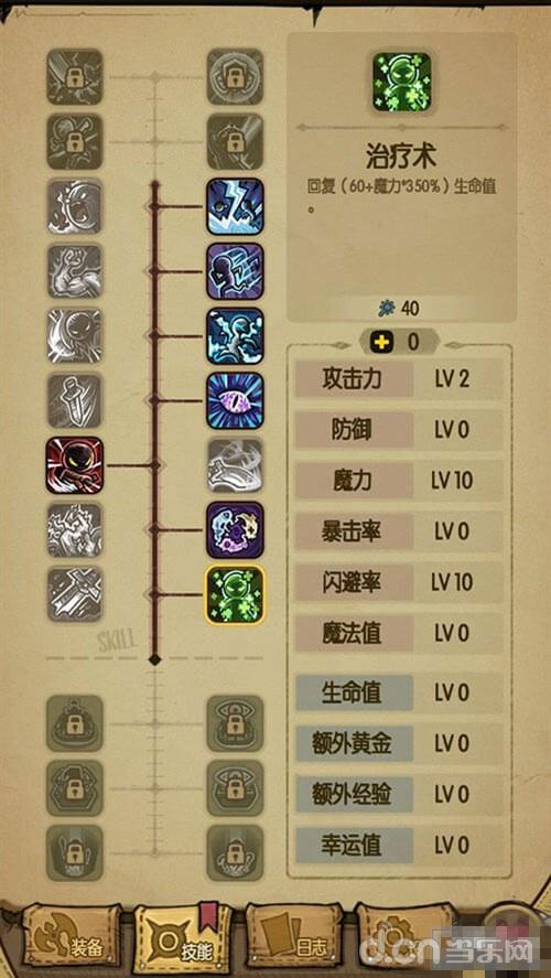 “治疗术”,回复(60+魔力*350%)生命值。10000魔力时,回复血量为35060。消耗40点魔法值施放一个“治疗术”,人物立即满血。