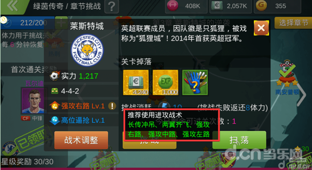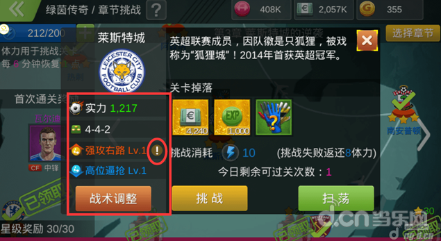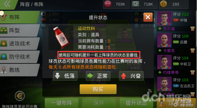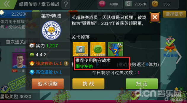 更换好阵型,设置好对应的战术之后,就可以去挑战对应的章节。不过需要注意的时候,在挑战之前要选择实力相差无几的敌人,这样三星通过的概率会比较大!想要提高获胜几率可以点击提升状态,不过需要注意的是这个“运动饮料”,随机提升1名上阵球员的状态至最佳。