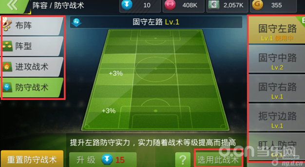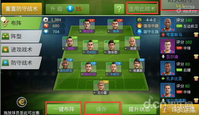 第四:点击战术调整,按照系统的提示更换自己的战术。战术和阵型都是可以进行升级的,使用对应的进攻、防守战术点和欧元可以进行升级,最后在更换完阵型之后,别忘记去布阵哦,可以点击一键布阵,之后再点击保存!