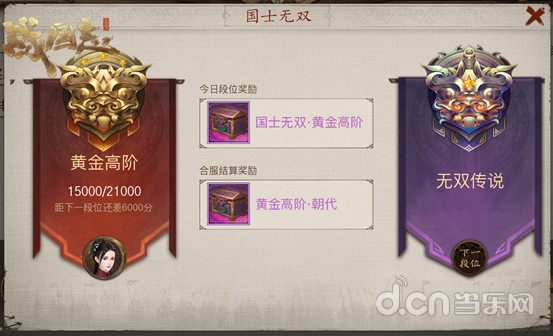 “国士无双”分为青铜、白银、黄金和无双传说四个段位,除了无双传说之外,每个段位还分为低、中、高三个小段位。希望将军多多参与,尽快提升段位获得更多的奖励。