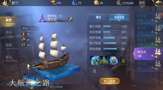 这只船整体比较均衡,没有什么太大的亮点,初期在没有好船的情况下,可以暂时作为旗舰、副舰使用,后期可以当做后备舰或者出售。