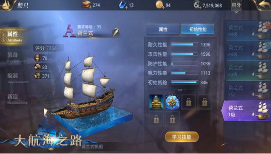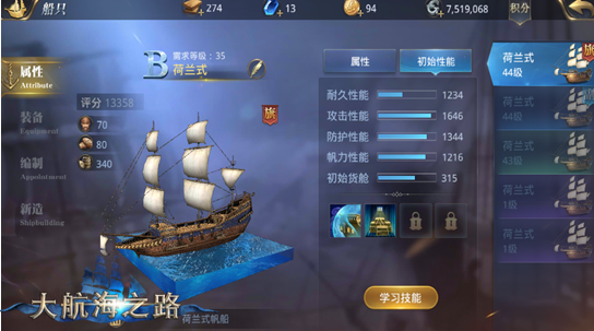 耐久1234,攻击1646,防护1344,帆力性能1216,初始货仓315