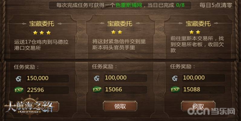 在体验“商会委托”收集珍贵物品赢得奖励的同时,所有等级达到32级的航海家,可以在消息灵通的酒吧老板处,领取内容丰富、难度各异的“宝藏委托”任务。宝藏委托的任务分为1/2/3等级,包括运送交易品、运送客人、投资、催债、战斗等丰富形式,星级越高则任务的奖励越丰富。任务完成后,玩家还会会获得色雷斯捕网珍贵道具奖励(在海上使用,一定几率捞到珍稀物品)。