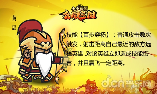 黄忠原是刘表帐下大将,后投入刘备帐下,为五虎将之一,勋位与羽等相仿。老当益壮,谋勇兼备,箭术能百步穿杨。重情义,不服老。在《小小军团合战三国》中可通过拜访名城“襄阳”获得。