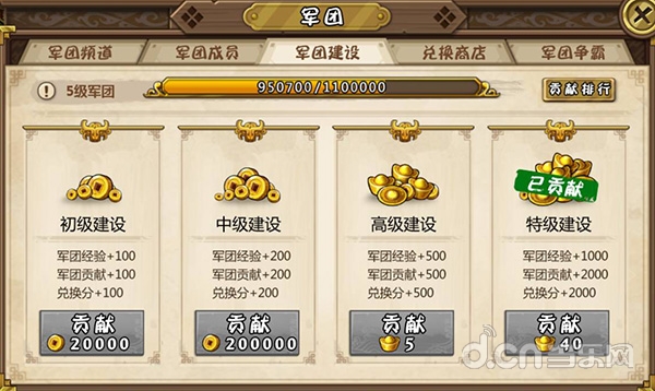 20W铜钱换200贡献,5元宝换500,40元宝换2000,每日只能选一个。