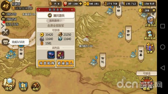 9:关于掠夺和驰援御敌!首先要知道掠夺消耗30点士气,驰媛需要20点士气,所以通过简单计算,如果打两场掠夺给的资源>三场驰媛给的资源那么可以选择打掠夺!我记着我30多级的时候查看掠夺还不合适,现在48级打掠夺给的资源就比驰媛高许多而且玩的还快!