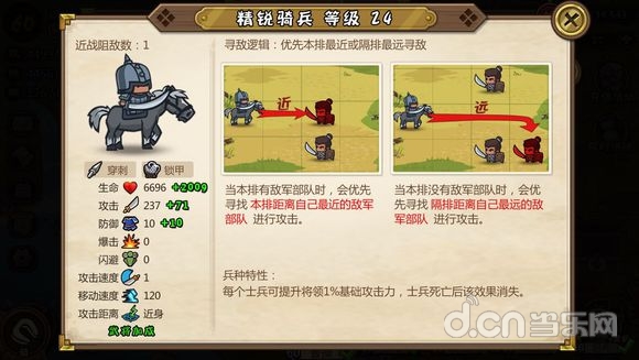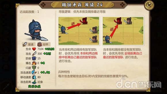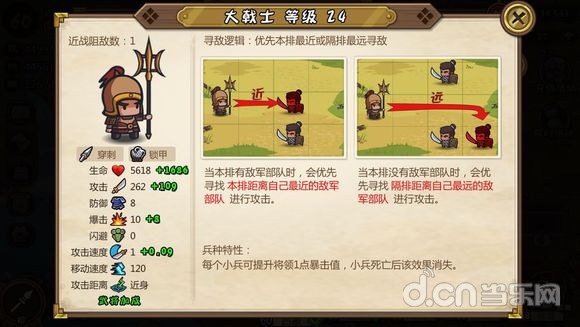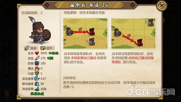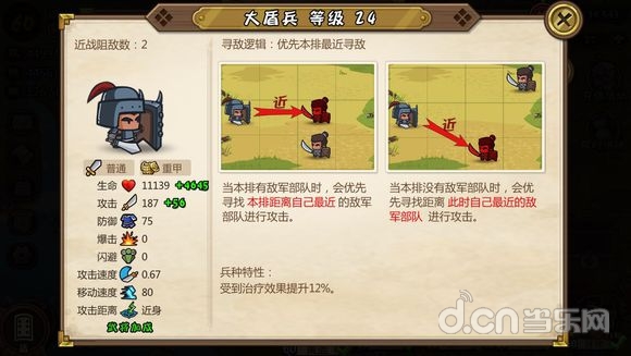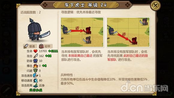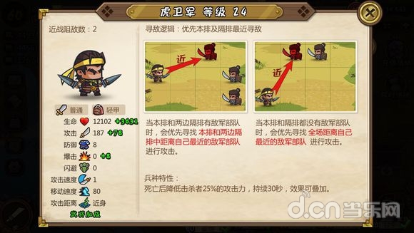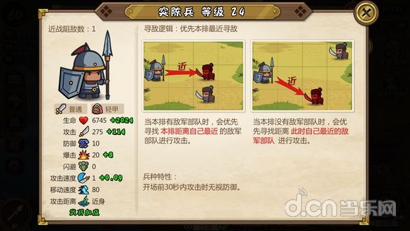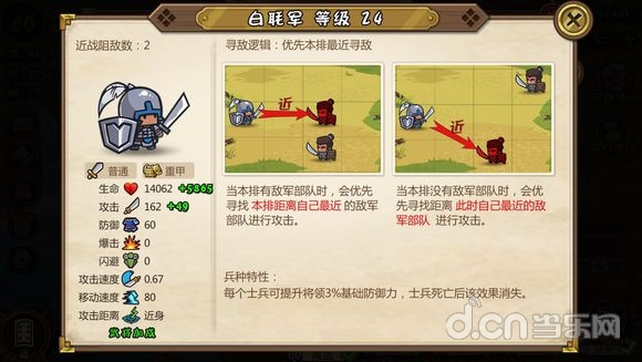 寻敌逻辑不多赘述,这是一个白板身材最硬的兵种,高血量高防御,是一道非常坚硬的屏障,兵种特性提高武将防御,从兵到将彻彻底底的大坦克。