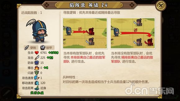 看图知道陷阵的寻敌逻辑和骑兵一样,就是一个冲锋突破打进后排然后疯狂输出的兵种,高攻击,穿刺伤害,打后排布甲单位真的是如同割草,兵种特性是第一次攻击打出自身血量12%的血,当你四星的时候陷阵有将近9000血,也就是第一次攻击打出1000多的血,对布甲单位已经很痛了。