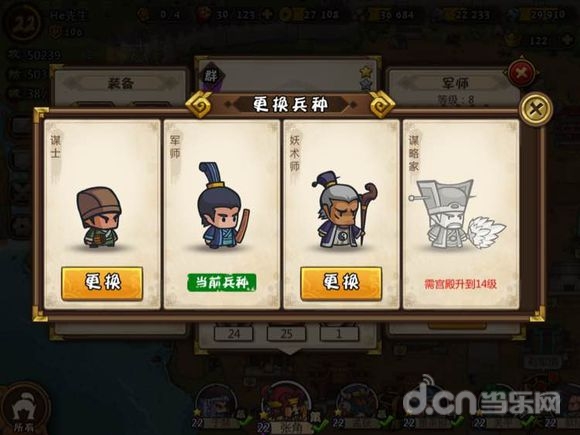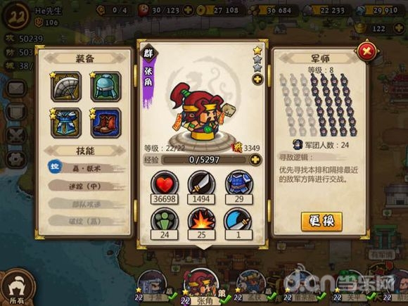 将与兵的羁绊,这是游戏最大亮点之一,以后的流派都是围绕这点来做功夫。游戏一共有 8种兵种,每兵种又可以进阶4类。4x8=32类兵,除第一阶无特性,其它各有不同。所以,每类将所进阶的兵种收益跟本上不一样,必有区分,不同军团,进阶更高级兵种后不可更换。以张角为例