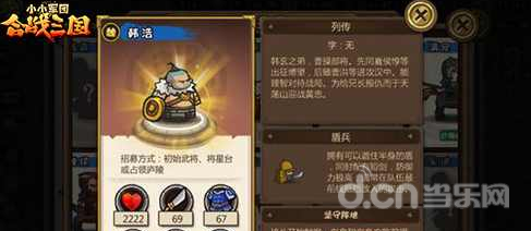 《小小军团合战三国》的盾兵武将并不难得,通过推图就能获得大部分盾兵。不过在这里我们重点推荐一下盾兵韩浩,韩浩有小魏延之称,魏延的主动技能战斗开始触发,自身和自身方阵获得减免普通攻击伤害32%。韩浩则可以减免自身和自身方阵获得减免普通攻击伤害15%。虽然减免比例不及魏延的一半,但作为蓝将,前期使用价值还算比较高。