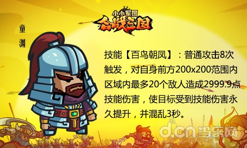 其他被动技能有【奋戈】自身攻击增加15%;【破阵】自身技能伤害效果增加20%;【破绽】自身对武将的伤害增加30%;【奋激】自身攻速提升20%。技能伤害效果增加一项结合主动技足以让童渊成为主公们的新宠了。