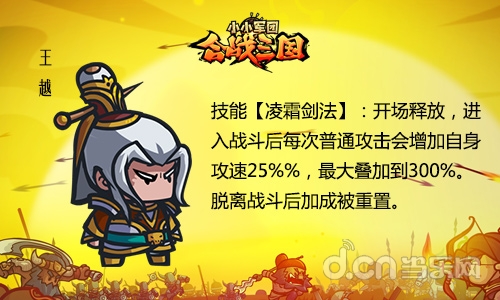 王越的主动技能【凌霜剑法】开场释放,进入战斗后每次普通攻击会增加自身攻速25%%,最大叠加到300%。技能进阶为【真·凌霜剑法】后最大叠加到400%,并且无视闪避。脱离战斗后加成均会被重置。“快剑”王越一称号由此而来,天下武功,唯快不破。
