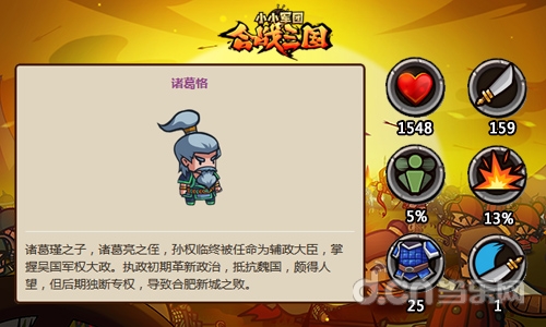 诸葛恪,幼时以神童著称,成人之后拜骑都尉,孙权长子孙登为太子时担任左辅都尉,作为东宫幕僚领袖辅佐太子理政。在游戏中,玩家可通过将星台招募该武将。其主动技能【同心并力】开场释放,武将升级至橙将时自身部队继承自己武将一定比例暴击值,并且增加相应暴击伤害和攻速。