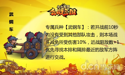 对应武将目前有魏延、于禁、郭淮。若开战前10秒内没有受到其他部队攻击,则本场战斗减免所受伤害10%,近战阻敌数+1,优先寻找本排和隔排最近的敌军方阵进行交战。全场免疫变形、击飞、混乱、眩晕。建造兵工坊,完成武将特殊关卡后可解锁该兵种。