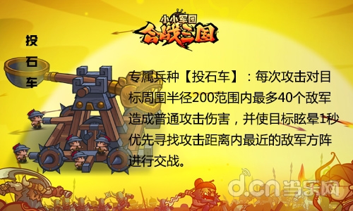 对应武将目前有黄月英、陆抗、诸葛恪。每次攻击对目标周围半径200范围内最多40个敌军造成普通攻击伤害,并使目标眩晕1秒,优先寻找攻击距离内最近的敌军方阵进行交战。全场免疫变形,击飞,混乱,眩晕。设计存在最小攻击范围,近战无法反击。建造军械营,完成武将特殊关卡后可解锁该兵种。