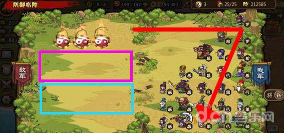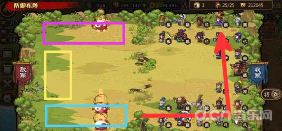 克制方法:红箭头为突破方向,蓝色框体为奶妈集中地,紫色框体为远程火力单位。下路空置(可适当将一盾兵单独放置,许诸最佳,周泰最下路替补)拖延敌正面部队攻伐,掩护我方延着红线突破的部队,上路进攻以计略辅助,借东风压制,美人计控制,骑兵则以华佗术(虎豹骑)辅助。