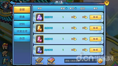《紫青双剑》的市场系统中可以选择在市面上已有的商品进行购买,如果自己有想要去拍卖的物品也可以通过寄售进行拍卖。首先点击头像,找到在屏幕上左下方的市场按钮,点开之后你会发现屏幕上多了很多商品,这就代表您已经进入到拍卖行的界面了。随后您可以在左侧列表中可以选择装备和道具,点开后可以看到当前所有玩家在出售的物品。而且还可以在界面下方直接输入物品名称并点击“搜索”,以缩小寻找范围,真是太方便不过了。