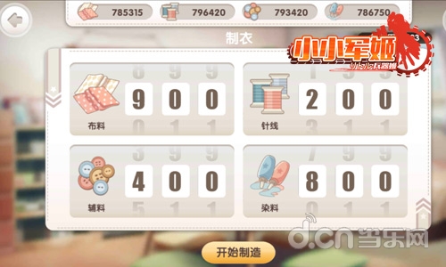 造衣服需要消耗四种材料:布料、针线、辅料和燃料,在制衣界面调好资源或者点击右下角套用别的玩家的建造日志,调配好资源后,点击“开始制造”。