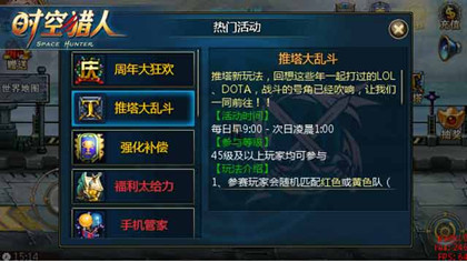 现在想玩Dota类游戏,不用等到回家上电脑了,拿出手机就能玩!《时空猎人》推塔大乱斗,给你最刺激的Dota游戏体验。参赛玩家战斗属性统一重置,所有职业禁用61级技能大招,进入《时空猎人》,点击“推塔”按钮,即可进入匹配。