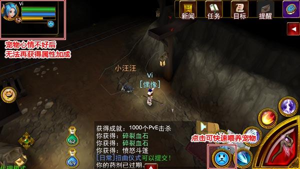 其中,宠物的心情好坏,是宠物非常重要的一个值。只有当宠物保持一个愉快的心情时,玩家才能获得宠物的属性加成,使用宠物技能,并且小宠物心情好的时候还会帮玩家自动拾取地上的金币以及战利品。当宠物跟玩家一起战斗时,会慢慢消耗其心情值。宠物心情不好以后,虽然还会参与战斗,但玩家会失去属性加成、宠物技能和自动拾取的宠物功能。当宠物呈现一个不好的状态时,在主界面点击原宠物技能按钮(宠物心情不好时变换)可快速喂养宠物,消耗游戏金币。
