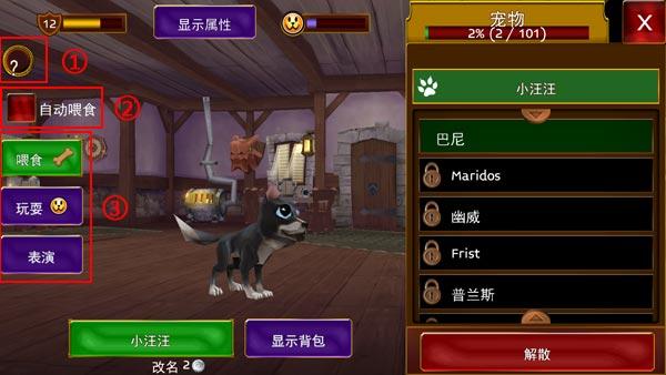 ③宠物互动动作。喂食:补充宠物心情值。玩耍:当玩耍按钮上出现宠物图标时,点击可恢复宠物心情值。表演:与宠物互动,它会卖个萌给你看哦。