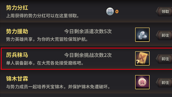 天下X天下厉兵秣马怎么玩,想要让势力快速升级,那每天的势力任务是必不可少的。厉兵秣马是势力里的一个副本,如切如磋,如琢如磨。翻译过来就是,平时多流汗,战时少流血。该副本为单人装备副本,在大荒各处接受磨练吧。