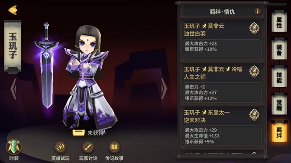 例如,玉玑子跟莫非云是大荒世界中最著名的一对师徒,当玉玑子再度与莫非云携手合作时能力大幅度提升,这就是羁绊——情;另一方面玉玑子与宋御风同为太虚观师兄弟,玉玑子曾规劝宋御风要直面邪影,但宋御风没有听他的劝告,最后受邪影所迫成为千古罪人,因此宋御风对玉玑子的输出伤害减少,这就是羁绊——仇。