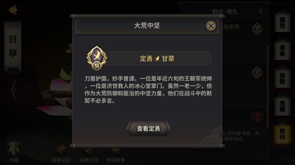 以出场率最高的英雄甘草为例,甘草与定勇搭配会有“大荒中坚”羁绊情的效果,治疗效果提升27、最大生命值增加158、银币获得提升9%。队伍中有这两个人,阵容就十分能扛了,只需要配上一个爆发型的强输出,便能一直碾压推进。
