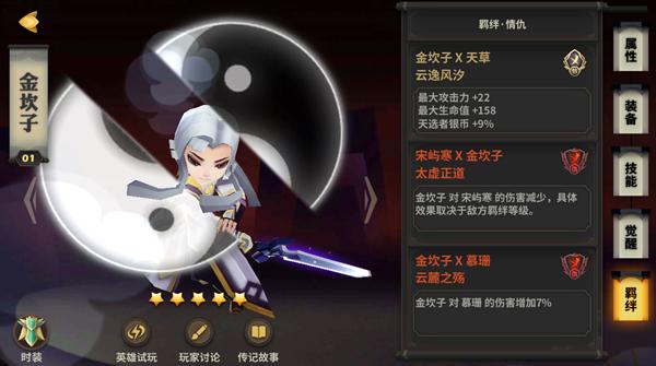 以宋屿寒和金坎子为例,两人本同为太虚观人,宋屿寒在太虚观有难时挺身而出,而金坎子却醉心邪术,自古邪不能胜正,金坎子对宋屿寒的伤害减少。所以天选者们进行英雄组队时一定要扬长避短,充分发挥每个英雄的特质。