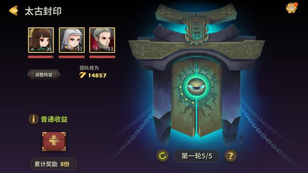 在“太古封印”中,玩家需用一组3人队伍连续闯关,挑战3轮,每轮5个关卡,最强可至15关,每过一轮,敌人会更加凶猛,奖励也会更加丰厚。英雄在关卡中的掉血、以及阵亡损耗均不可复原,可以说打的就是持久战,也因此,要想取得一路高歌的战绩,必须合理安排出战阵容,