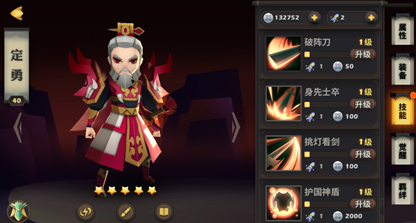 虽然定勇俨然是一老头,可大将风范犹在,新手玩家完全可以一直培养下去。技能升点方面,优先将【身先士卒】点满,【挑灯看剑】仅作为打断技能,能学习到即可。而【山河壮】和【铁哥行】作为定勇的神级技能能点即点。