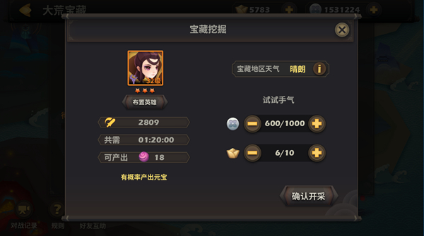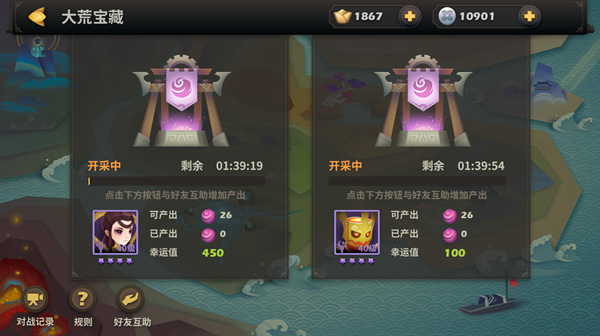 进入“大荒宝藏”模块,系统会自动匹配能与之一战的藏宝点,打败敌方守宝英雄,就能占领藏宝点,吃他的肉挖他的宝——除了能稳定挖出宝物,还有机会挖出大荒世界中的珍稀道具哦!