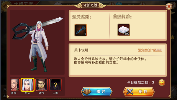 敌人会分好几波进攻,守护场中的伙伴英雄是我们的通关目标。在阵容搭配上,推荐上阵有补血技能的英雄。