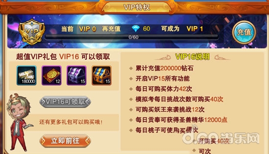 VIP1:充值60钻石、VIP2:充值300钻石、VIP3:充值600钻石、VIP4:充值1000钻石、VIP5:充值2000钻石