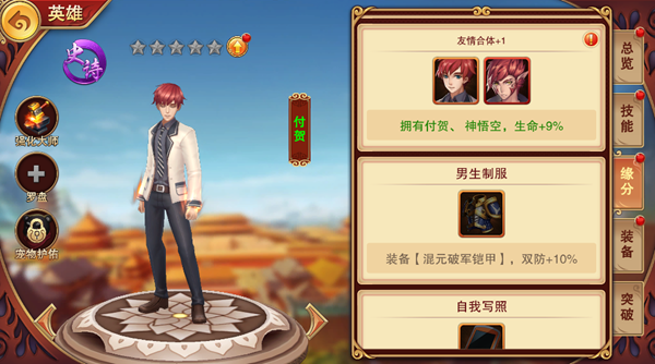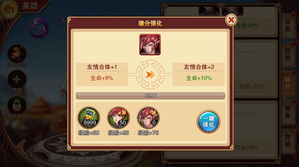 4.缘分培养可以用缘分卡片或对应的英雄碎片/装备碎片来提升经验值。