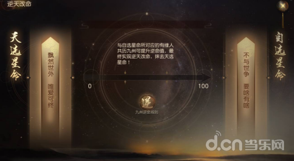每个玩家在进入到九州世界之后,都会被星辰赋予一个独特的星命,这个星命便是天选星命。星命是十二主星赋予人的命运,但绝非不可改变。正所谓“大道五十,天衍四十九,人遁其一,是为定数,也为变数。”星命之中存在变数,而变数便是我们改变命运的关键。我们可以通过抗争来获取属于自己的自选星命,从而彻底改变自己的命运。