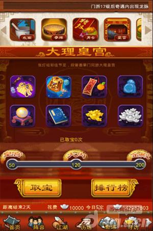 掌门进入大理皇宫会发现,大理皇宫分为皇宫、大内和金殿,掌门游览到对应地点,段誉将奖励一件皇宫重宝,玩家取宝50次将进入皇宫、取宝达到120次玩家将进入大内、取宝200次进入金殿掌门即有机会获得皇宫重宝,每次活动开放获得的宝物不同哦,此外还有机会获得培养丹、许愿宝碟、精炼材料、大量银两等珍宝。